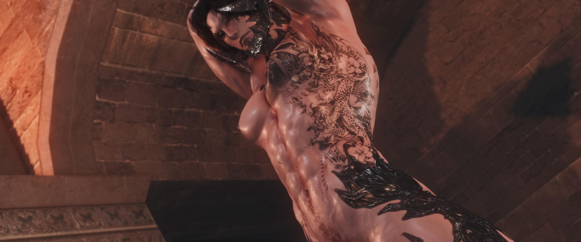 HEIGHT 7 fulms, 8 ilms WEIGHT 415 ponze of pure muscle HAIR Jet black and crimson EYES Depthless black SCARS Many PIERCINGS Nipples TATTOOS Detailed inkwork on his left arm and side